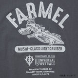 左胸ポケットに本企画ならではの、UNIVERSAL OVERALL ×ジオンマークのシリコンラバーネーム、背中にジオン公国軍のムサイ級宇宙軽巡洋艦FARMELをデザイン、色々なシーンでカジュアルに着こなすことができます。"