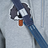 クラシックなデニムの切り替えに、ブルーレザーのディテールをあしらい、上質で洗練された印象に。